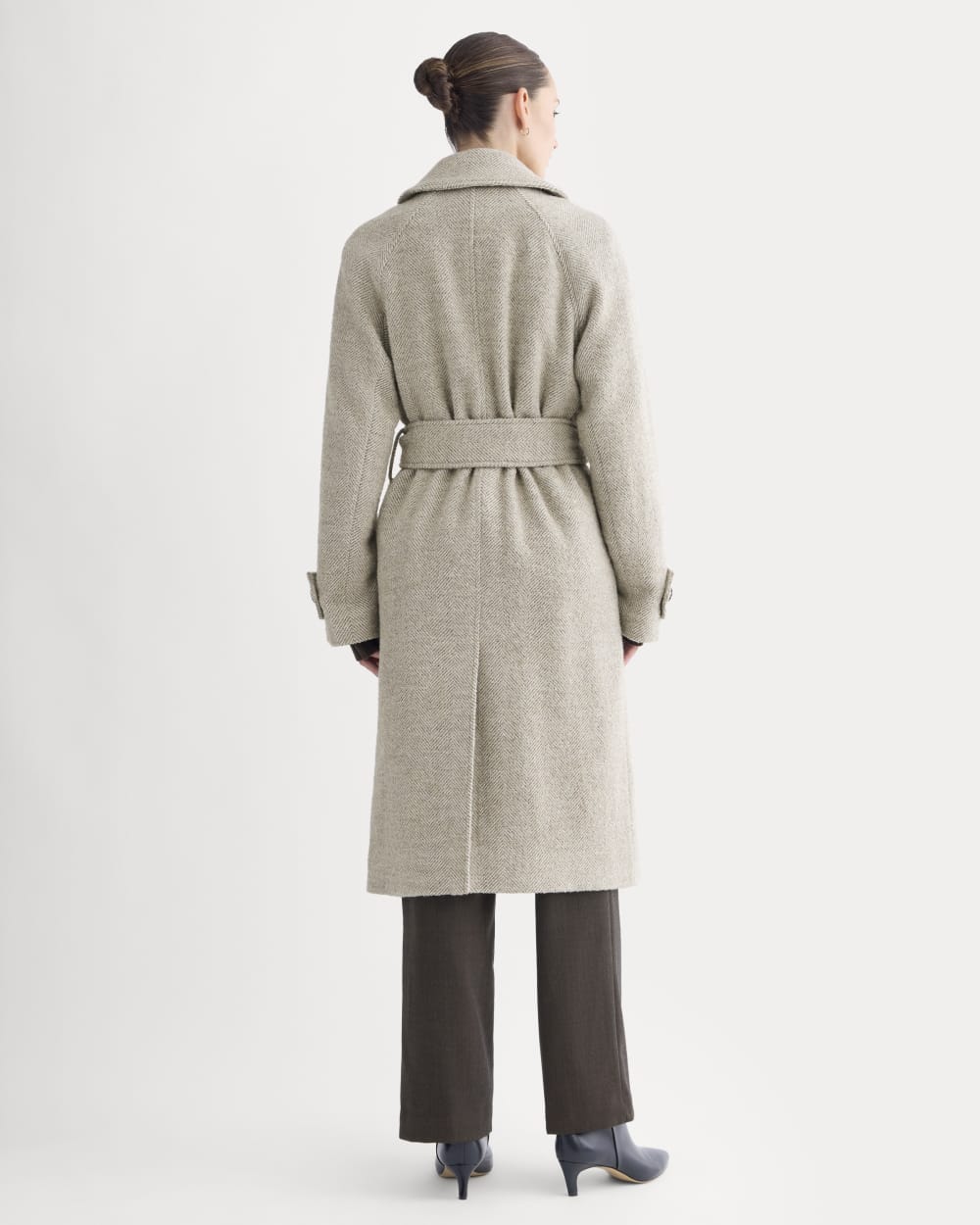Because it’s just that exceptional. Featuring a button-front closure. front welt pockets. adjustable tabs on the sleeves. and a tie belt to cinch you in. Made with a recycled wool blend produced in Italy at Manifattura Emmetex. Herringbone design with textured boucle yarn finish and wooly handfeel. Heavyweight and hits below the knees??so you can show off your tall boots.