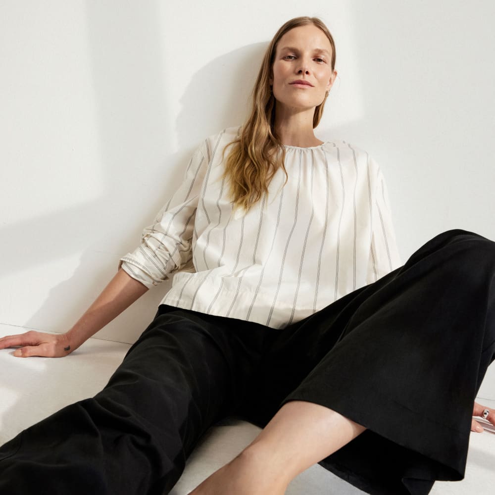 Shirting takes on new moods with this easy Poplin Breeze Shirt. Made with poplin cotton. our signature gathered crewneck at the front makes way to a fully open back with a neat self-tie at the neck. Gentle dropped shoulders and a buttoned cuff that can be rolled up keep things low-key and oh-so chill.Cotton poplin is densely woven. making it both durable and breathable. also giving it a crisp. cool feel.